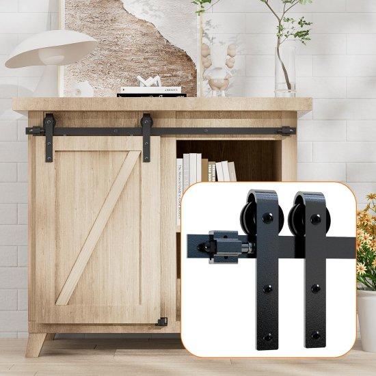 Yaklaşık 76 cm (2.5 ft) uzunluğundaki bu sürgü kapak sistemi, kolay kurulum özelliğine sahiptir. Metal raylar siyah renkte olup, endüstriyel bir görünüm sergiler. Ahşap kapılar yumuşak ve sessiz bir şekilde kayarak açılıp kapanır.