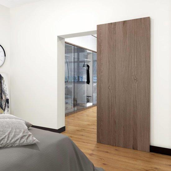 Bu ürün, modern iç mekan tasarımları için ideal bir sürgü kapı sistemidir. Ağır hizmet tipi donanım seti, 122 cm’ye kadar kapılar için kullanılabilir. Mat gri metal aksam ve ahşap dokulu kapı paneli, minimalist ve şık bir görünüm sergiler.