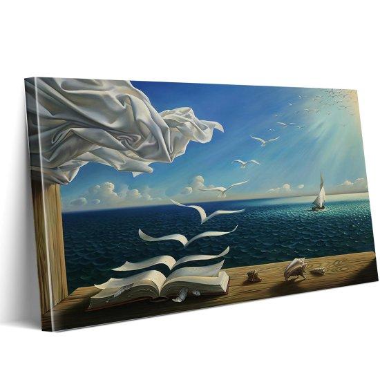 Sürrealist sanat tarzının benzersiz örneklerinden biri olan bu tablo, hayal gücünü harekete geçiren bir görsel sunar. Açık bir kitaptan çıkan sayfa parçaları, bir yelkenli ve gökyüzündeki kuşlar, izleyiciye gerçeklik ile hayal arasında bir yolculuk yaşatır.