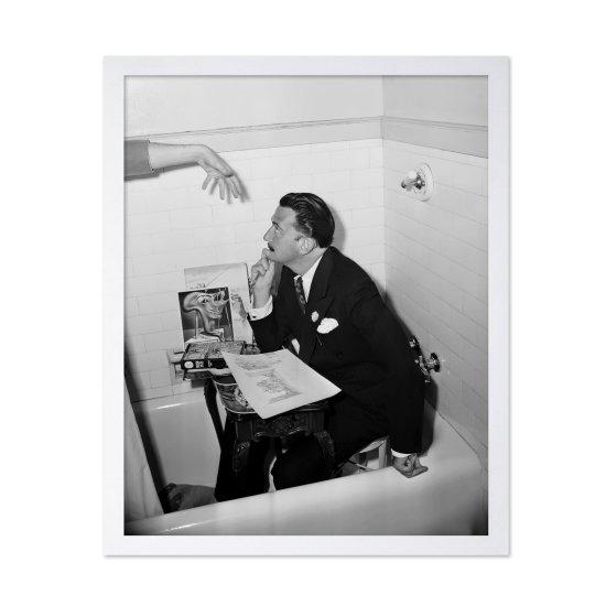 Bu poster, ünlü sürrealist ressam Salvador Dalí’nin eğlenceli ve sıra dışı bir anını yansıtan benzersiz bir duvar sanatı eseridir. Siyah çerçeveli siyah beyaz fotoğraf, sanatçının banyo içinde gazetesini okurken çekilmiş ilginç bir karelerini sergiliyor.
