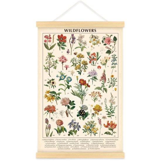 Ahşap çerçevesi ile rustik bir görünüm sergileyen poster, yumuşak bej tonlarında bir çerçeveye sahip. Çerçevenin üst kısmında asma için ip bulunuyor. Çiçek çizimleri son derece detaylı ve gerçekçi, her bir bitkinin yaprak, dal ve çiçek özellikleri net bir şekilde gösterilmiş.