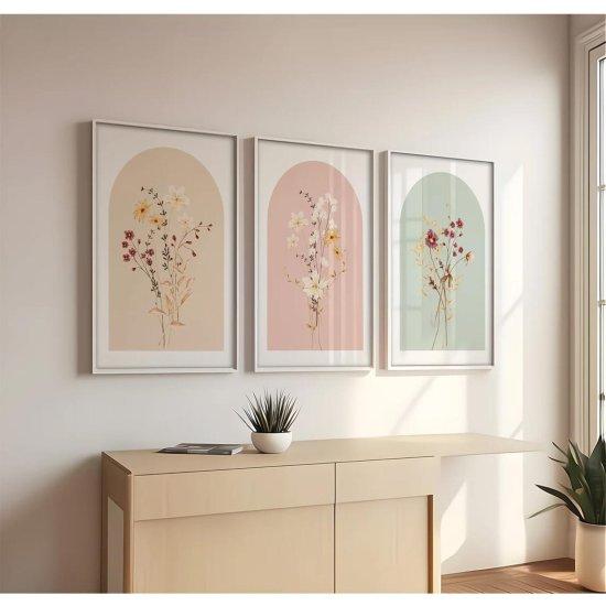 Her tablo 41×61 cm boyutlarında olup, pastel tonlarda (bej, pudra pembe ve açık yeşil) arka plan üzerine yumuşak fırça darbeleriyle çizilmiştir. Çerçeveli ve çerçevesiz seçenekleri mevcuttur. Çiçek aranjmanları minimalist bir yaklaşımla resmedilmiş, doğal ve sade bir görünüm sunmaktadır.