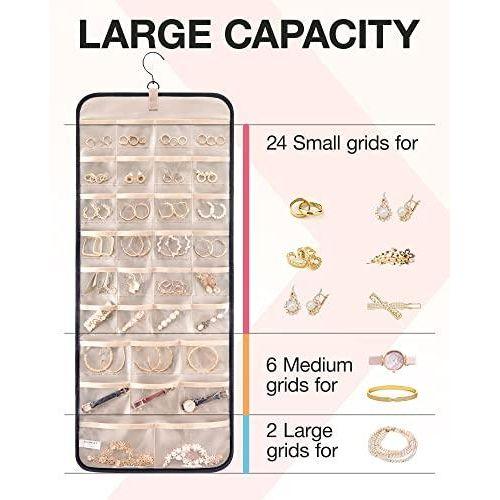 Ürünün bir yüzünde 32 adet şeffaf cep bulunuyor. Bu ceplerde yüzükler, küpeler, bileklikler, saatler ve tokalar gibi küçük takıları düzenleyebilirsiniz. Diğer yüzünde ise 42 kolye için özel tasarlanmış dalgalı metal kancalar yer alıyor.