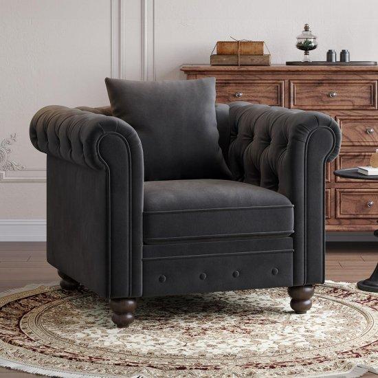 Bu tekli koltuk, klasik Chesterfield tarzının modern yorumunu sunar. Antrasit gri rengi sayesinde her türlü iç mekana zarifçe uyum sağlar. Yumuşak kadife dokulu kumaşı, oturma konforunu artırırken aynı zamanda estetik bir görünüm yakalar.