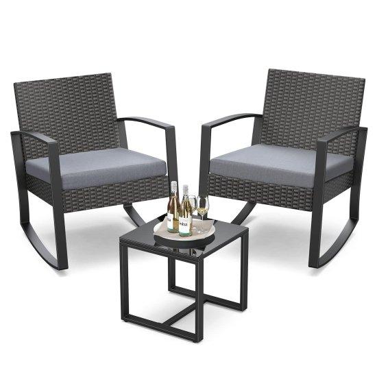 Mobilya takımı dayanıklı rattan dokulu gri bir malzemeden üretilmiştir. Koltuklarda yumuşak gri yastıklar bulunuyor. Metal çerçeveli sallanır koltuk tasarımı, konforlu ve estetik bir görünüm sağlıyor.