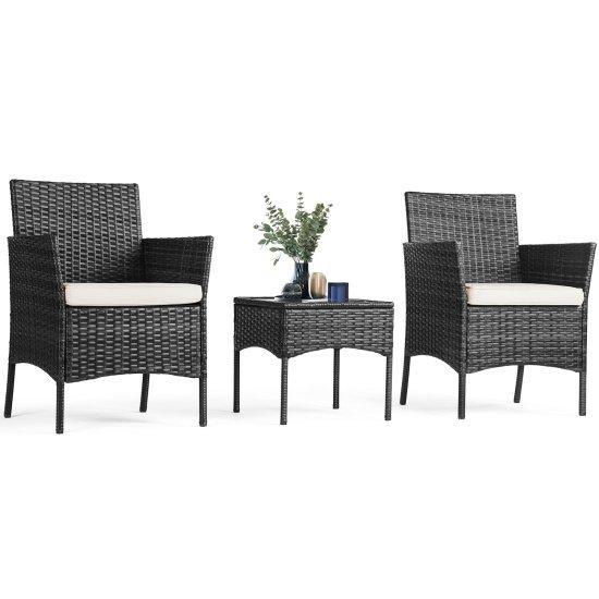 Bu zarif teras sandalyesi takımı, dış mekan kullanımı için ideal bir çözüm sunmaktadır. Siyah renkli dokulu rattan malzemeden üretilen set, iki adet konforlu koltuk ve küçük bir orta sehpadan oluşur.