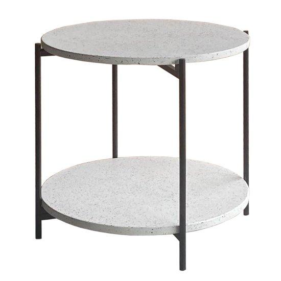 Sehpanın üst ve alt katmanları beyaz-gri tonlarında terrazzo desenli yüzeye sahiptir. İnce metalik gri çerçeve, hafif ve şık bir görünüm sergiler. Yuvarlak tasarımı, farklı mekanlara kolayca uyum sağlar.