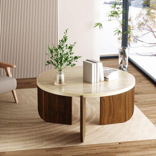 Doğal Taş Dokulu Yuvarlak Modern Traverten Orta Sehpa