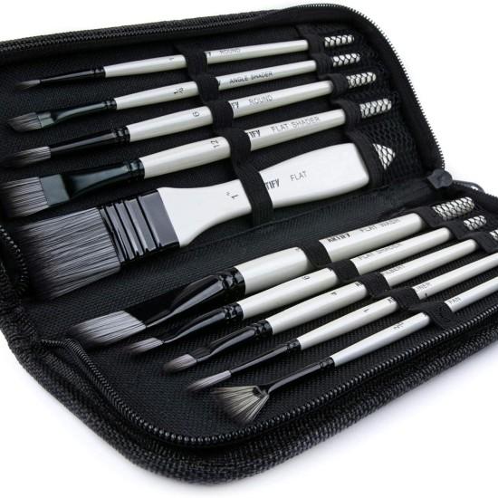 Bu tuval fırçası seti, sanatçılar ve resim meraklıları için ideal bir aksesuar. Beyaz saplı ve siyah kılıflı set, 10 adet farklı boyutta ve formda fırça içeriyor. Naylon kıllarıyla akril, sulu boya, yağlı boya ve guaj boyama tekniklerine mükemmel uyum sağlıyor.