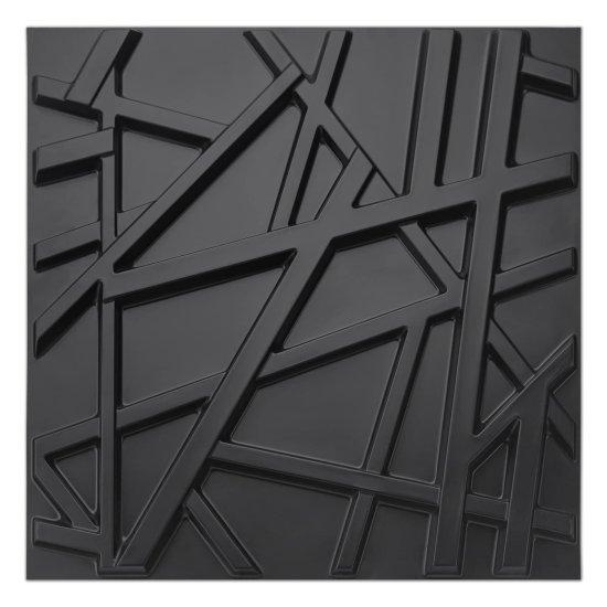 Bu duvar paneli, modern iç mekan tasarımları için ideal bir dekoratif aksesuar niteliğinde. Siyah rengi ve çarpıcı geometrik deseniyle her mekana modern bir hava katar. Yaklaşık 50×50 cm boyutlarında üretilen panel, kesişen çizgilerden oluşan özgün bir tasarıma sahip.