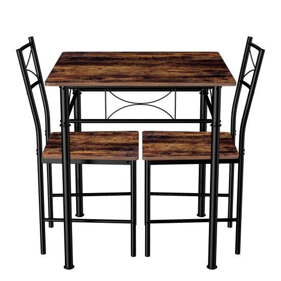 Masa ve iki sandalyeden oluşan set, dikdörtgen formunda kompakt bir tasarıma sahip. Ahşap yüzey, sıcak tonlu kahverengi ile rustik bir görünüm sergiliyor. Mat siyah metal ayaklar, masanın alt kısmını destekleyerek modern bir görünüm yaratıyor.