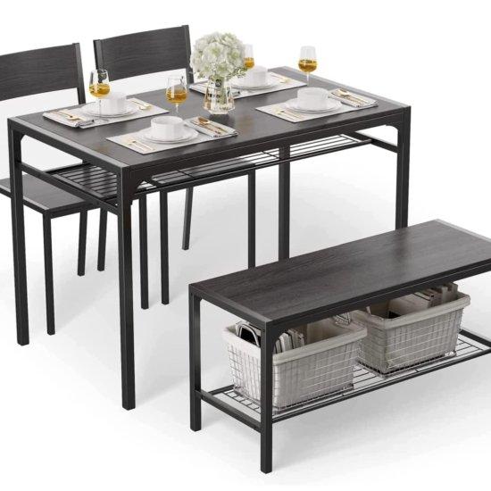 Bu ürün, küçük mutfaklar ve dar yaşam alanları için ideal bir çözüm sunuyor. Siyah metal çerçeveli, antrasit gri renkli kompakt bir yemek masası seti, iki sandalye ve bir banktan oluşuyor.
