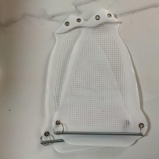 Ürün tamamen beyaz renkte olup, üzerinde mikro delikli desenli bir yüzey bulunmaktadır. Bu desenli yapı, ısıyı eşit dağıtarak yanma riskini azaltır. Metal klipsli tasarımı sayesinde kolay monte edilebilir ve ütü tabanına güvenle sabitlenebilir.