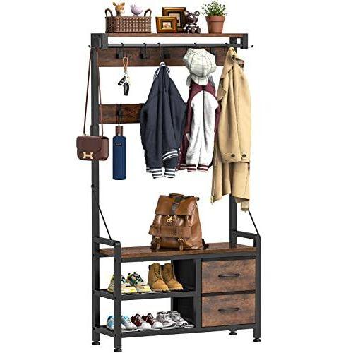 Siyah metal çerçeve ve kahverengi ahşap detaylarıyla rustik bir görünüm sergileyen ürün, farklı ev stillerine uyum sağlayabilir. Geniş askı alanı ve çok yönlü depolama seçenekleriyle girişler, yatak odaları veya çalışma alanları için ideal bir aksesuar.