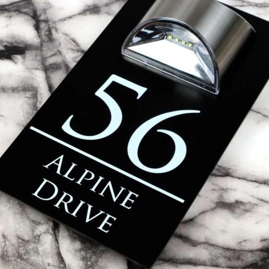 Levha, dayanıklı ve profesyonel görünümlü siyah bir zemin üzerine “56” numarası ve “ALPINE DRIVE” adres bilgisini içerir. Solar aydınlatma özelliği sayesinde gece vakti tamamen ücretsiz ve çevre dostu bir şekilde aydınlanır. Herhangi bir elektrik bağlantısına ihtiyaç duymadan güneş enerjisiyle çalışır.
