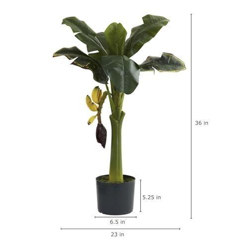 Detaylı incelendiğinde oldukça gerçekçi görünen yapay muz ağacı, yaklaşık 91 cm boyunda ve 58 cm çapındadır. Koyu yeşil renkli geniş yaprakları, sağlam gövdesi ve üzerindeki sarı-siyah meyveleriyle doğal bir görünüm sergiler. Siyah renkli küçük bir saksıya yerleştirilmiştir.