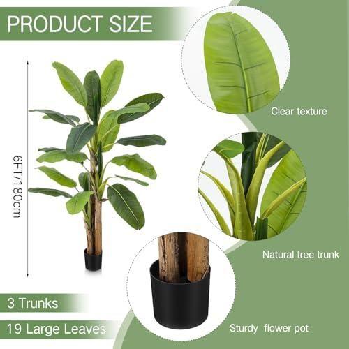 Yaklaşık 213 cm (7 fit) boyundaki bu yapay ağaç, yüksek kaliteli PE yapraklardan üretilmiştir. Geniş, canlı yeşil yaprakları, gerçekçi gövdesi ve doğal muz kabuğu görünümüyle tam bir doğallık sergiler. Gri renkli toprak saksısı ve simüle edilmiş yosun detayları, bitkinin gerçekçiliğini artırır.