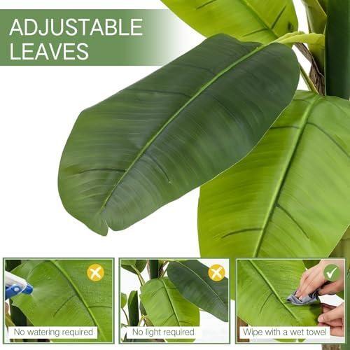 Yapay muz ağacının yaprakları yumuşak ve esnek malzemeden üretilmiştir. Zengin yeşil tonlarda hazırlanan yapraklar, dokunulduğunda gerçek yaprak hissi verir. Üzerinde sarı ve kırmızı renkli küçük muz meyveleri bulunur, bu detay ürüne doğallık katar.