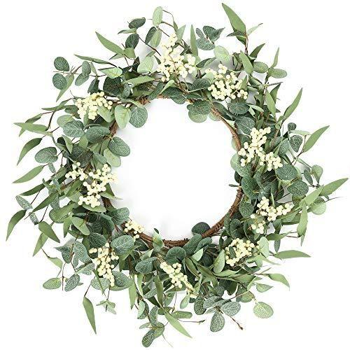 Beyaz Çiçekli Yeşil Okaliptüs Çelenk Dekoratif Aksesuar