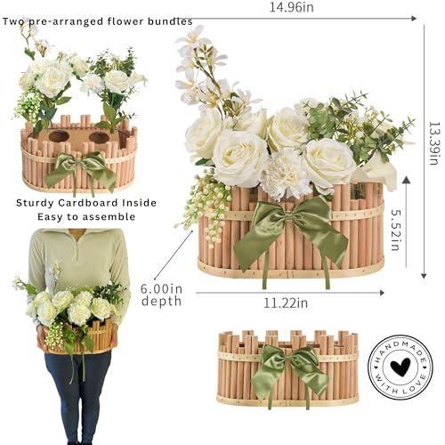 Ürün, hassas işçilikle hazırlanmış yapay çiçeklerden oluşuyor. Beyaz güllerin yanı sıra, farklı tonlarda yeşil yapraklarla zenginleştirilmiş bir kompozisyon sergiliyor. Sepeti çevreleyen ahşap çubuklar, doğal ve sıcak bir görünüm sağlıyor.