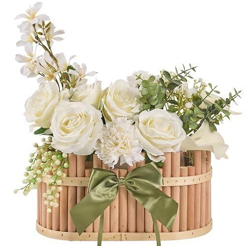 Bu dekoratif ürün, modern ve şık ev dekorasyonları için mükemmel bir çözüm sunuyor. Doğal ahşap dokulu bir sepet içerisinde, zarif beyaz güller ve çeşitli yaprak türlerinden oluşan bir çiçek aranjmanı yer alıyor.