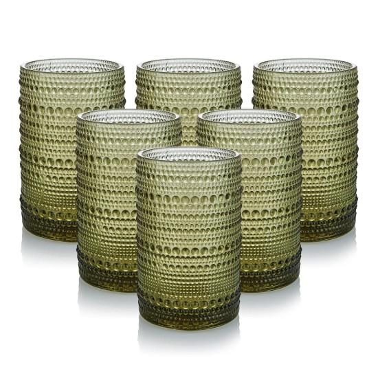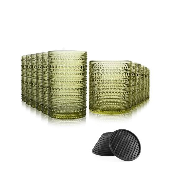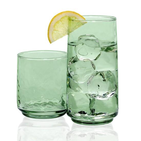 Bu bardak takımı, klasik ve şık bir tasarımı bir araya getiren benzersiz bir mutfak aksesuar seti. Nefis yeşil renkli cam bardaklar, vintage tarzın modern yorumunu yansıtır. Toplam 12 adet bardaktan oluşan set, 6 adet yüksek bardak (15 oz) ve 6 adet rocks bardak (14.5 oz) içerir.