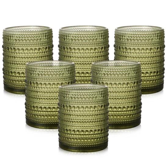 Bardakların yüzeyi, geleneksel hobnail dokusuna sahip. Bu dokusal desen, cam yüzeye zengin bir görsel derinlik ve karakteristik bir görünüm kazandırır. Yumuşak yeşil tonları, bardaklara doğal ve zarif bir estetik sağlar.