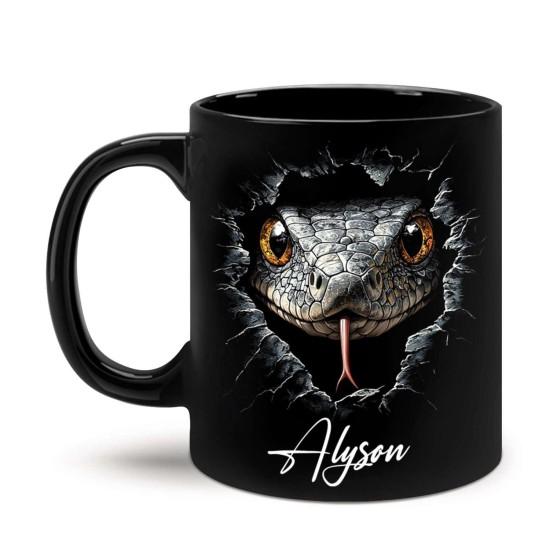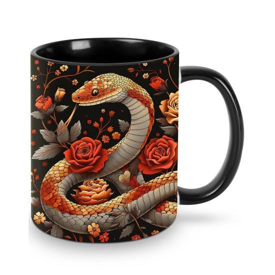Yüksek kaliteli seramikten üretilen fincan, yaklaşık 325-425 ml arası hacme sahiptir. Yılanın detaylı ve üç boyutlu görüntüsü, fincanın arka planındaki siyah renk ile mükemmel bir kontrast oluşturur. Yılanın keskin ve canlı gözleri, adeta fincanın içinden izleyiciyi süzmektedir.