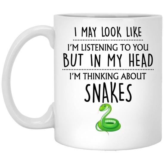 Üzerindeki “I may look like I’m listening to you, but in my head I’m thinking about SNAKES” yazısı ile mizahi bir tavır sergiliyor. Alt kısımda yer alan küçük yeşil yılan çizimi ise fincanın ana temasını tamamlıyor.