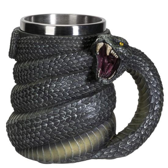 Fincanın iç kısmı paslanmaz çelikten üretilmiş, dış kısmı ise ayrıntılı bir şekilde yılan derisi dokusuna benzer şekilde modellenmiştir. Açık ağızlı, keskin dişli yılan figürü, fincanın kulp kısmını oluşturarak hem estetik hem de işlevsel bir tasarım sunuyor.