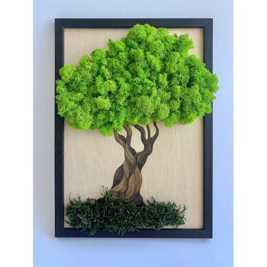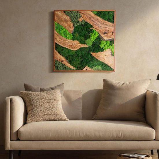 Sürdürülebilir kaynaklardan elde edilen sedir ağacı ve doğal yöntemlerle korunmuş yosunlar kullanılarak üretilen bu duvar sanatı, çevre dostu bir dekorasyon seçeneğidir.
