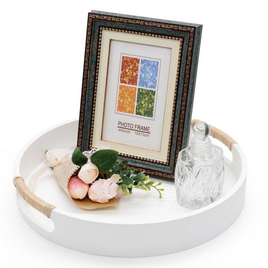 Üzerinde vintage çerçeveli bir fotoğraf, cam biblo ve dekoratif objeler bulunduran tepsi, salon ve oturma odaları için şık bir aksesuar niteliğindedir. Beyaz rengi sayesinde farklı dekorasyon stilleriyle uyum sağlar.