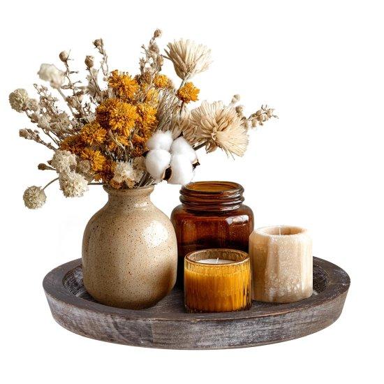 Tepsi, kahve masaları, mutfak tezgahları veya salon sehpaları için ideal bir aksesuar. Üzerinde altın renkli seramik vazo, amber tonlu mumluk ve kahverengi cam kavanoz bulunuyor. Bunlara ek olarak, sarı ve beyaz tonlarda kurutulmuş çiçek aranjmanı tepsinin estetik değerini artırıyor.