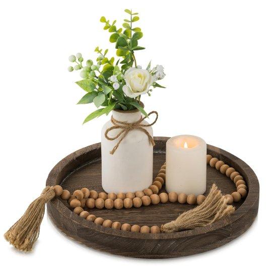 Ürün, çay mumu, küçük bitki vazosu ve dekoratif boncuk süslemelerle birlikte kullanılabilir. Ahşap boncuk süsleme ve püsküllü detaylar, tepsinin estetik çekiciliğini artırır. Beyaz seramik vazo ve mumla birlikte mükemmel bir çiçek aranjmanı oluşturabilirsiniz.