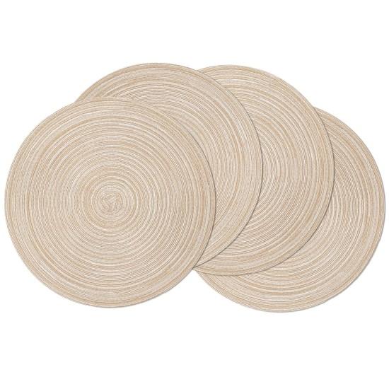Bu ürün, mutfak ve yemek masası için şık ve pratik bir çözüm sunan yuvarlak amerikan servis seti. Yumuşak bej tonlarında, dokulu örme desenli dört adet amerikan servisten oluşuyor. Her bir servis 38 cm çapında, yuvarlak ve organik bir görünüme sahip.